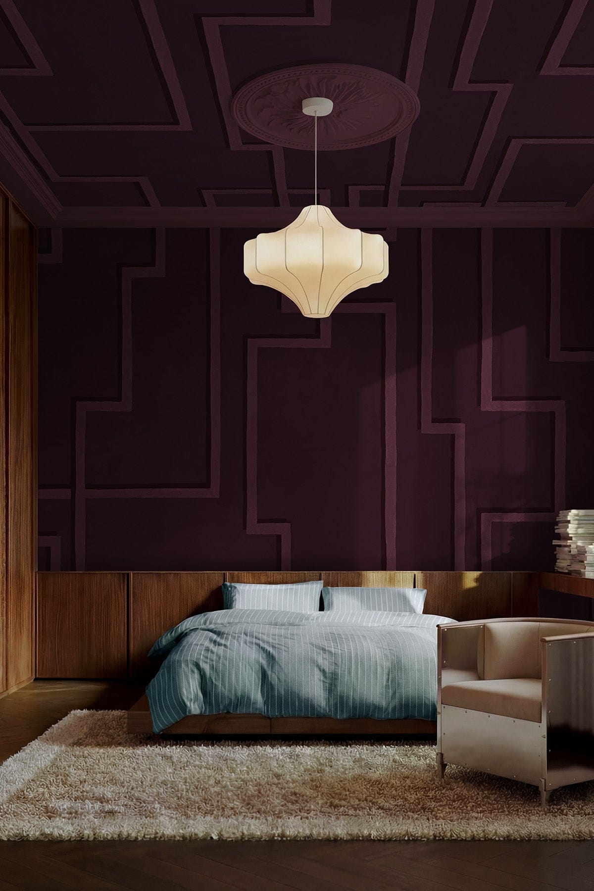 Modern bedroom with purpur art deco geometric wall design and pendant light