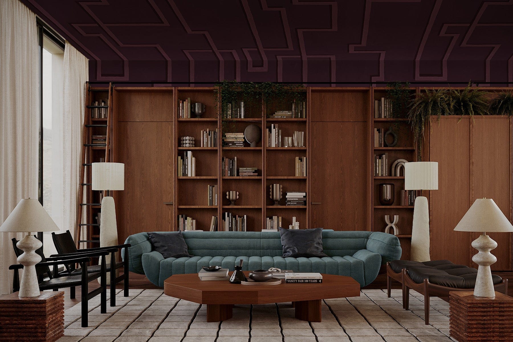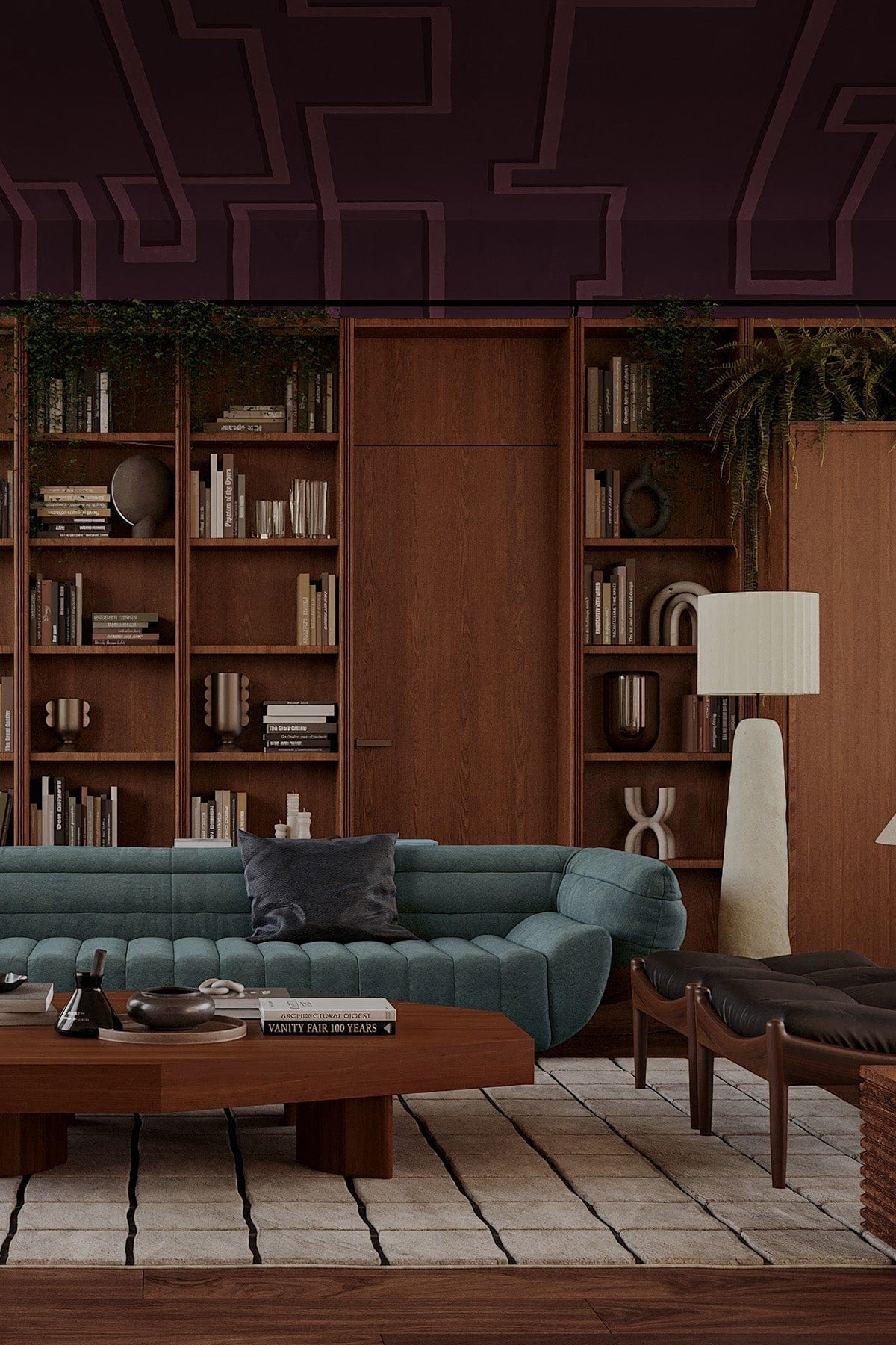 Art deco wall mural in purpur on the walls of this Modern living room with a teal sofa, wooden coffee table, and bookshelves.