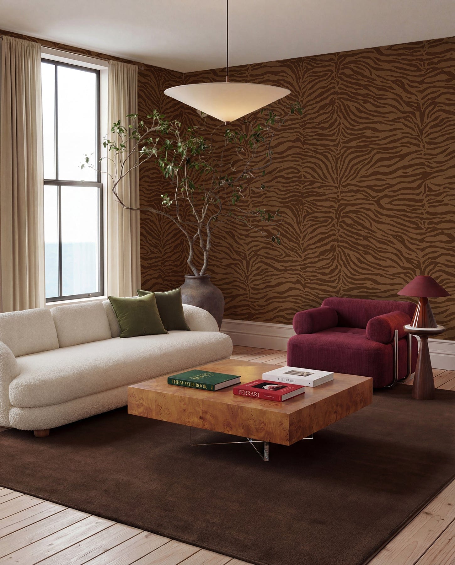Modern living room with a white sofa, wooden coffee table, and patterned wall. Brown zebra stripe pattern on a brown background