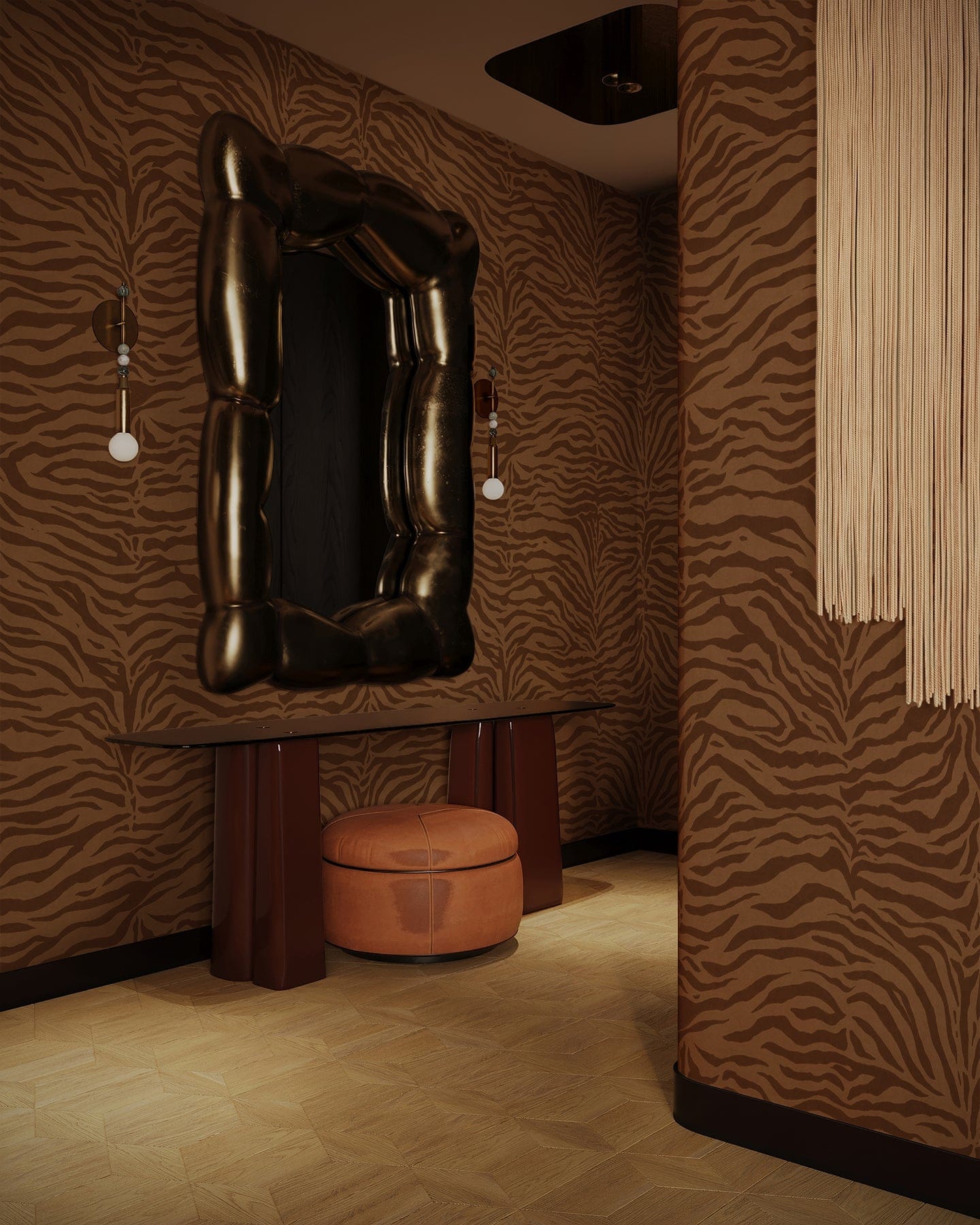 Decorative interior with a large metallic mirror, brown ottoman, and patterned walls brown zebra stripe pattern on a brown background.