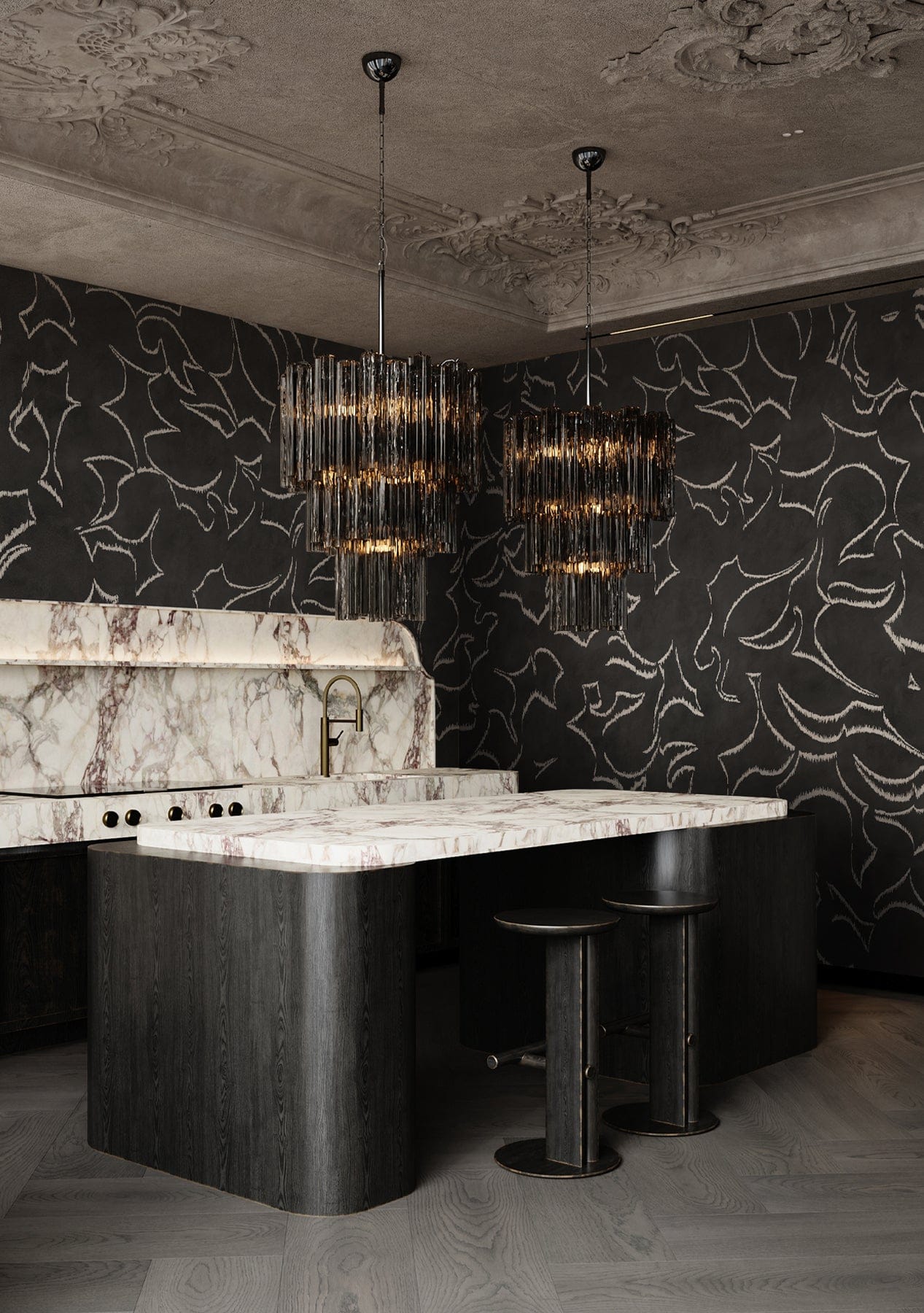 Black background with white floral lace pattern on the walls of this modern kithcen with a black kitchen island with a white marble top