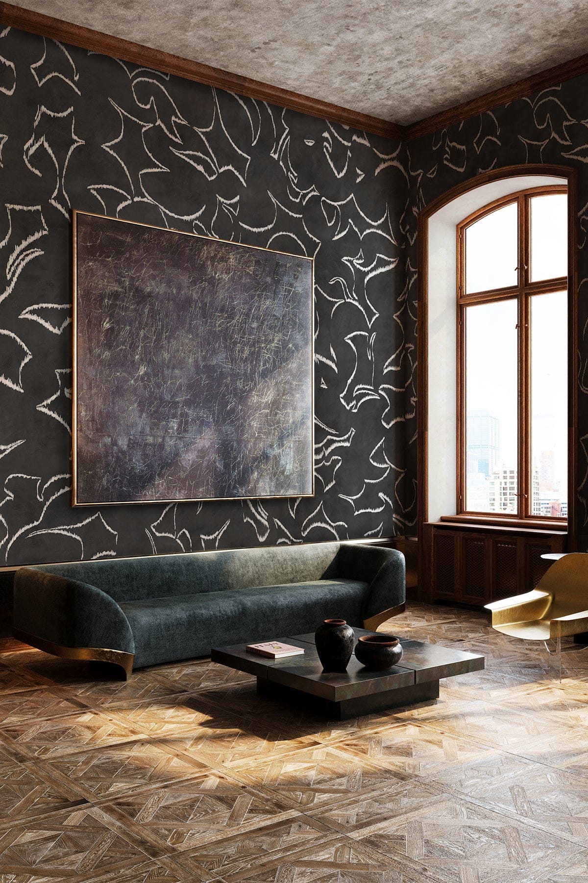 Modern living room with dark patterned wallpaper, gray sofa, and decorative elements.
