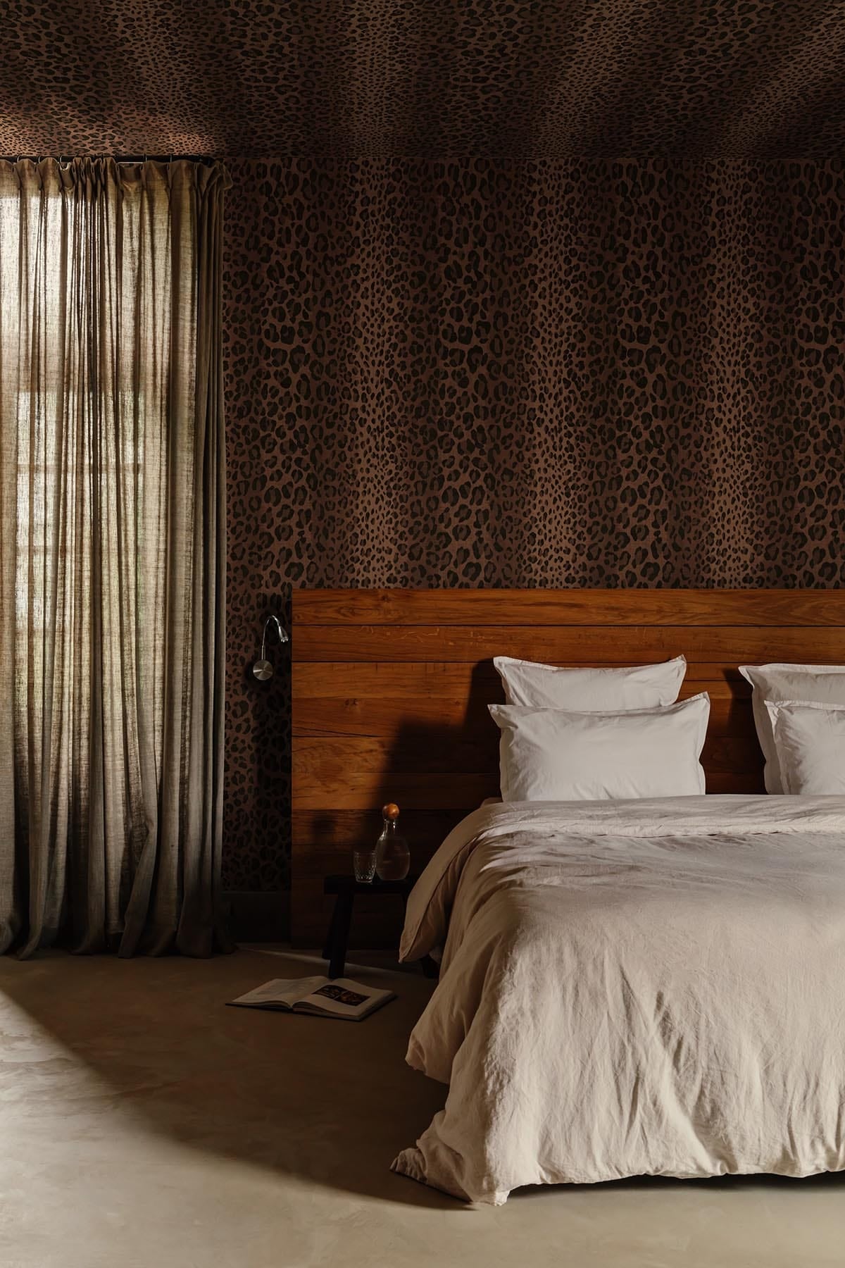 Bedroom with wooden headboard and Leopard wallpaper on a brown background on the walls and ceiling