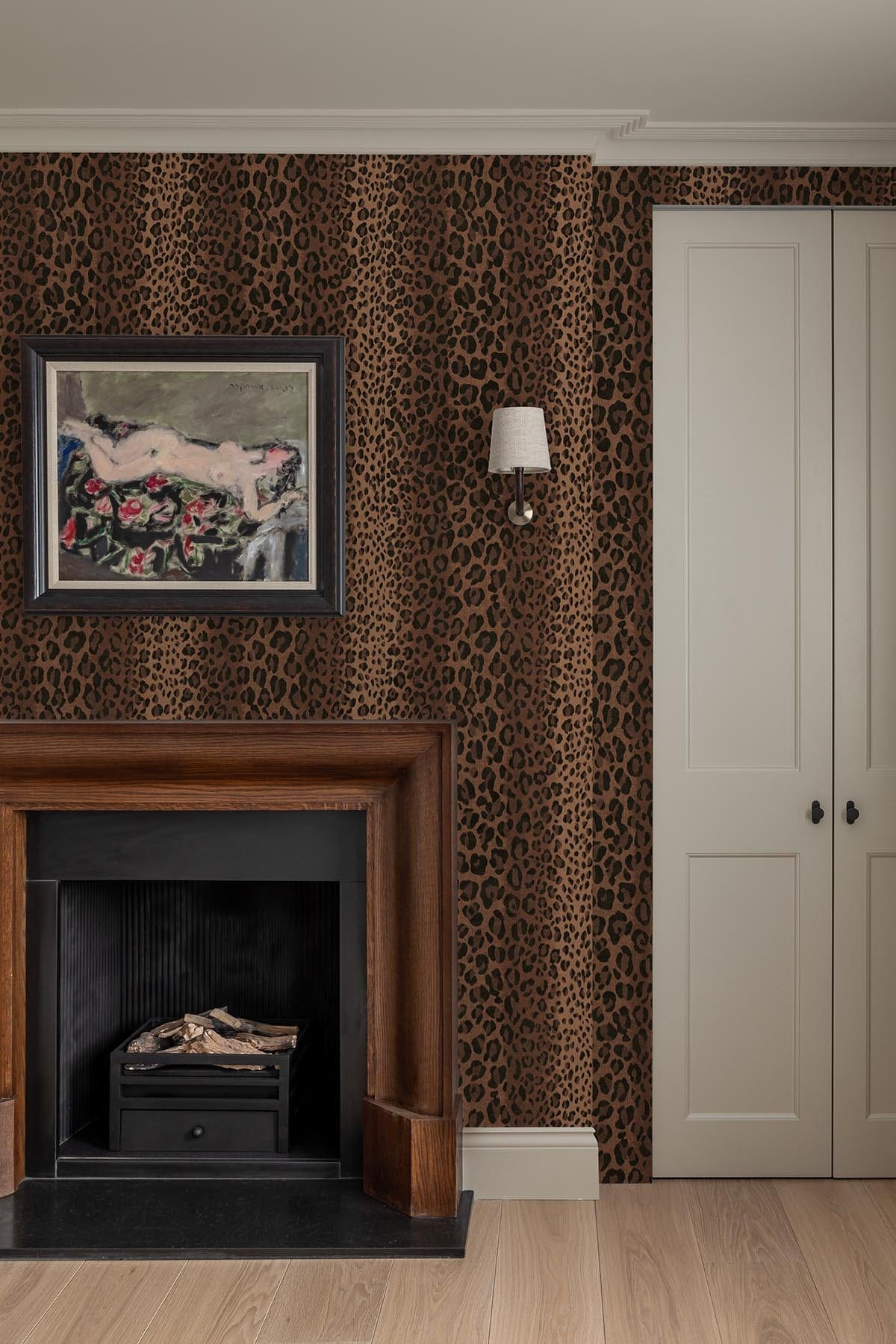 Room interior with leopard print wallpaper, fireplace, and white door.