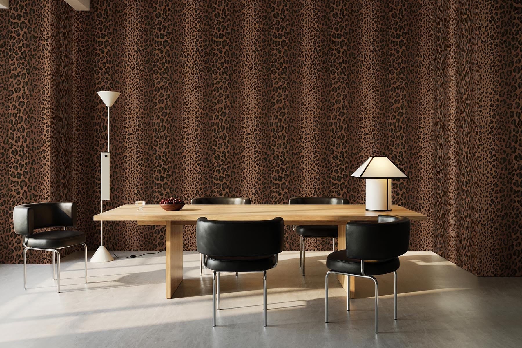 Modern dining room with a Leopard wallpaper on a brown background, wooden table, and black chairs.
