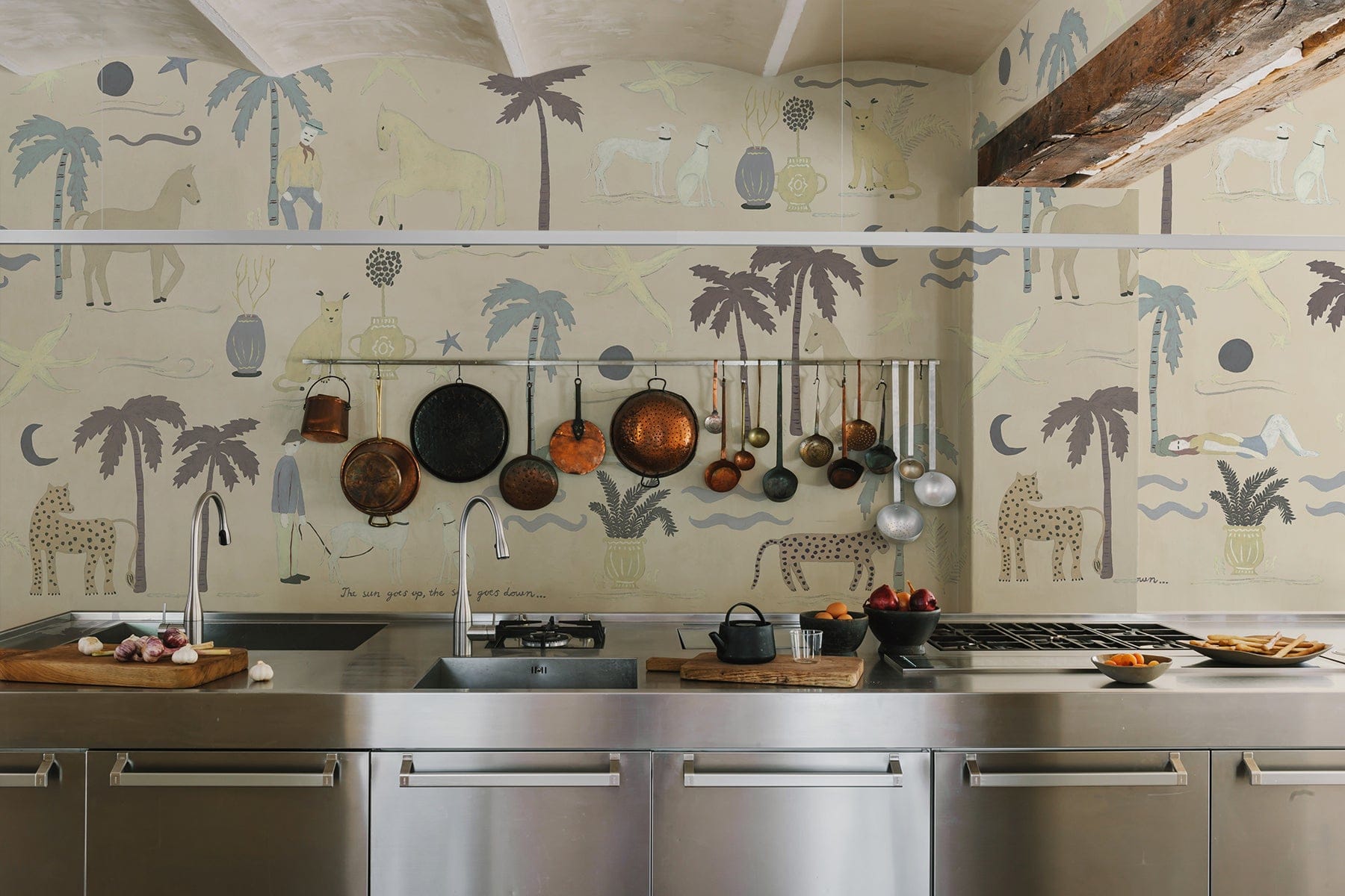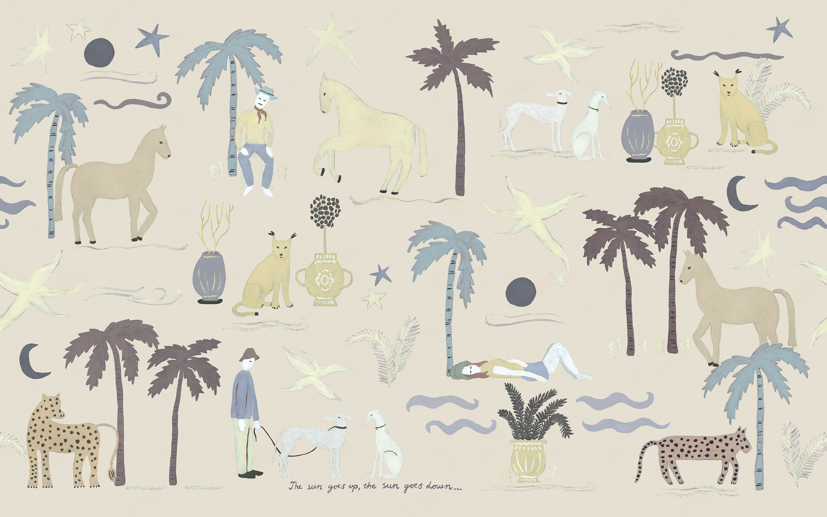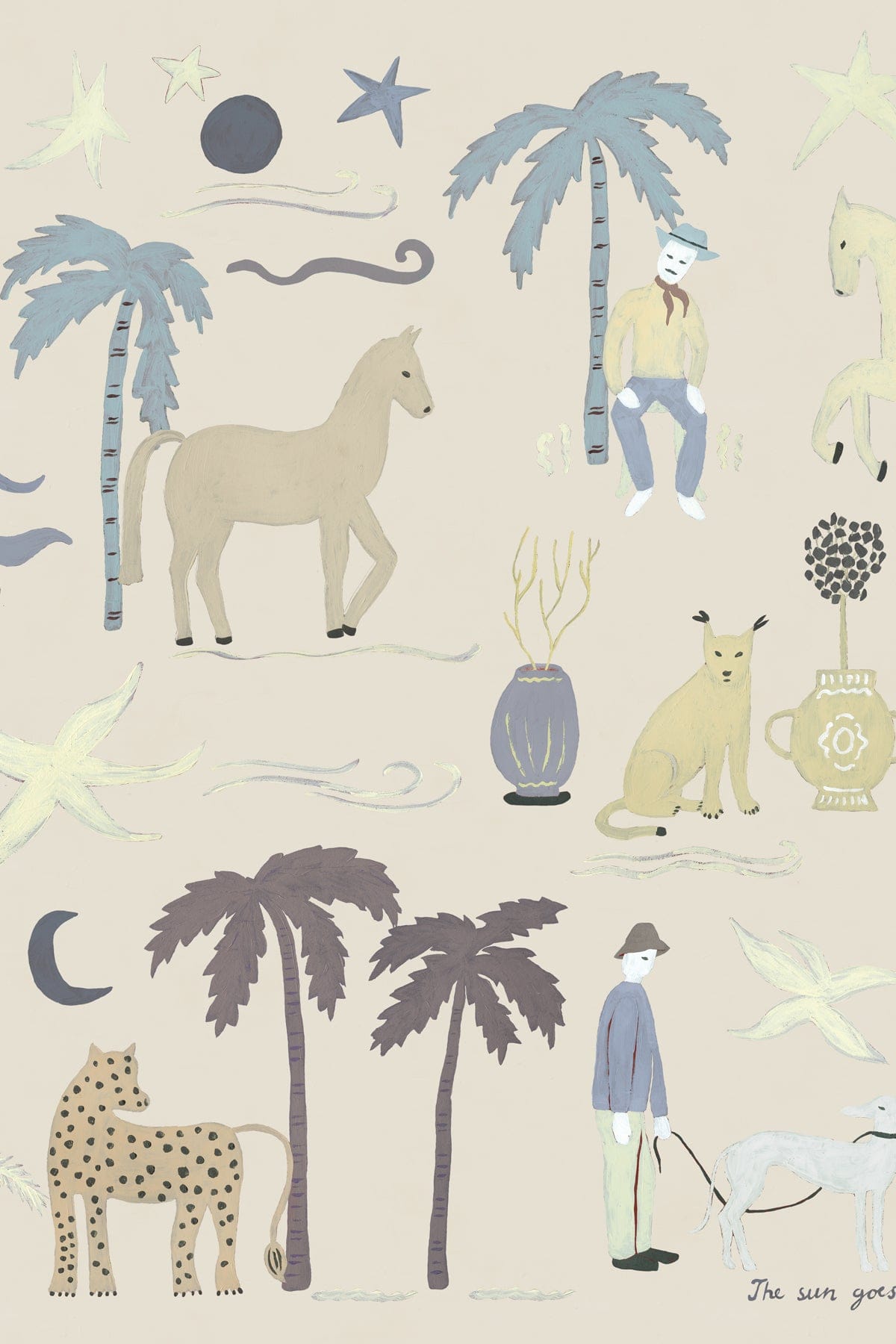 Washed by sunlight and softened by time, A Day in France in Beige rests on a muted, almost chalky background that feels beautifully lived-in. Scattered across the surface, small illustrated patches reveal palms, horses, stars, and figures in motion, like fragments from a Mediterranean daydream. The composition feels curated yet effortless, as if collected from travels and pinned onto the walls of an eclectic home. The warm beige tone enhances the vintage character while keeping the expression airy and refined. Playful in detail yet sophisticated in mood, it invites storytelling into the room.
