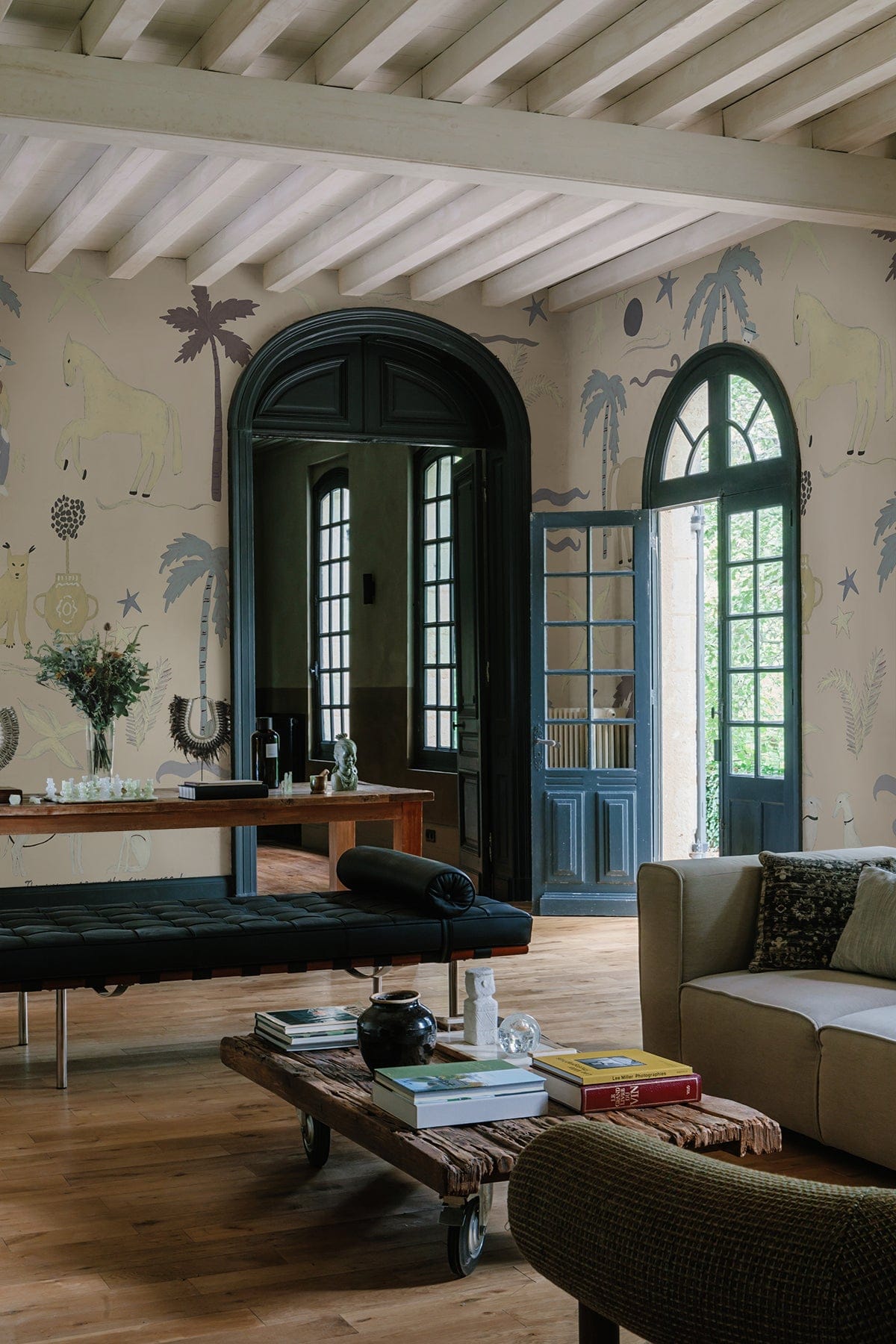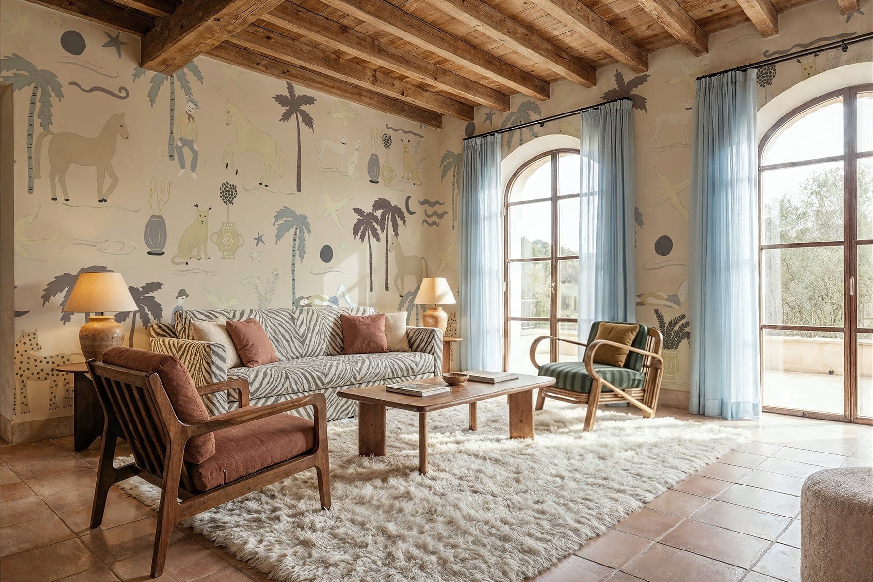 Living room with wooden beams, patterned wallpaper, and large windows.