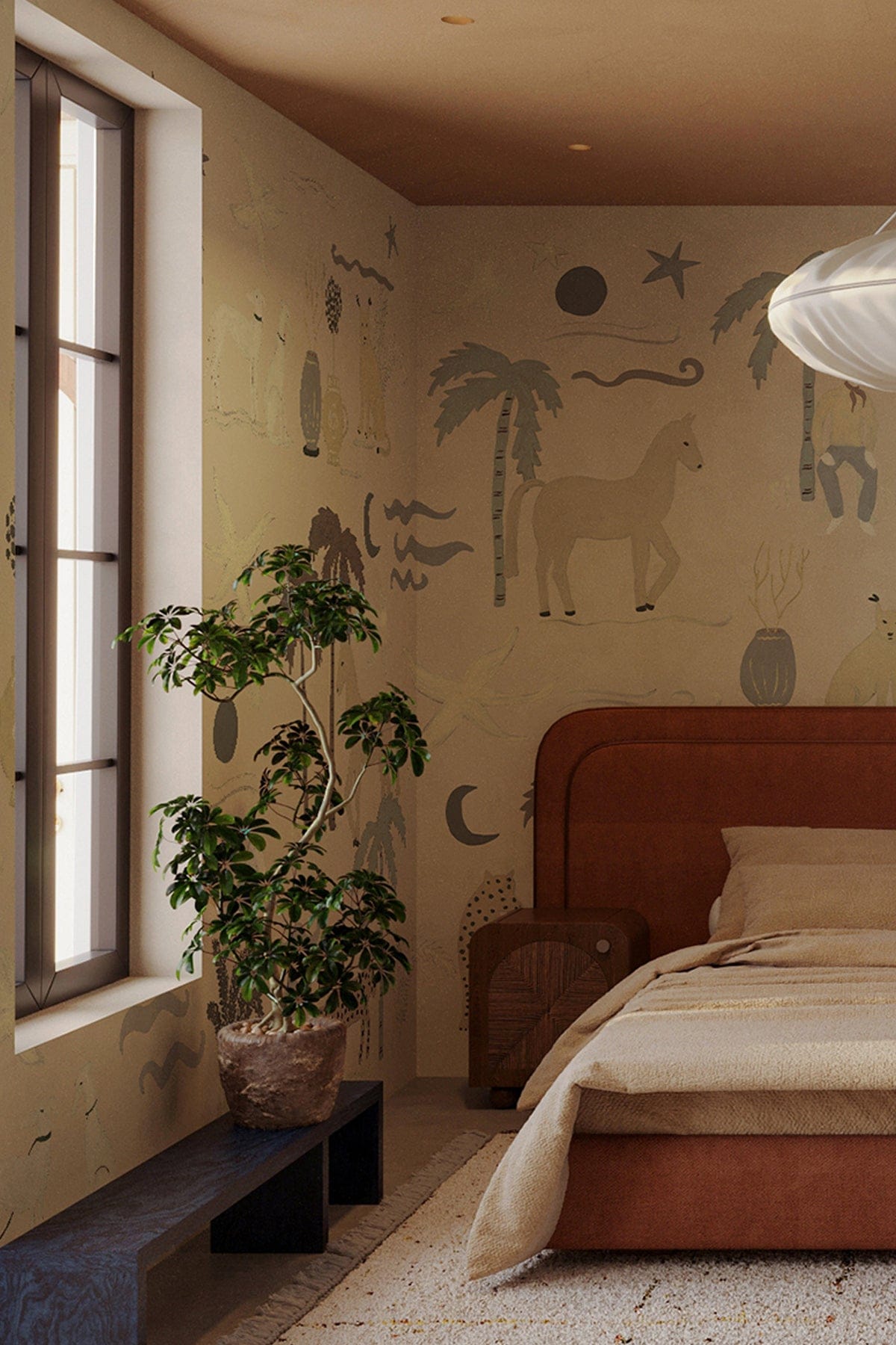 Bedroom with decorative wall art, plant, and wooden bench.