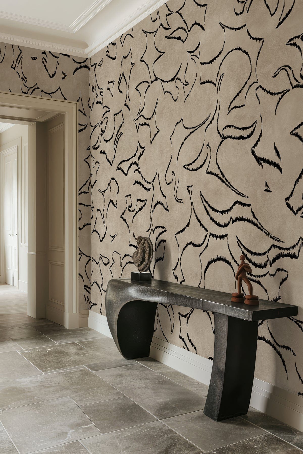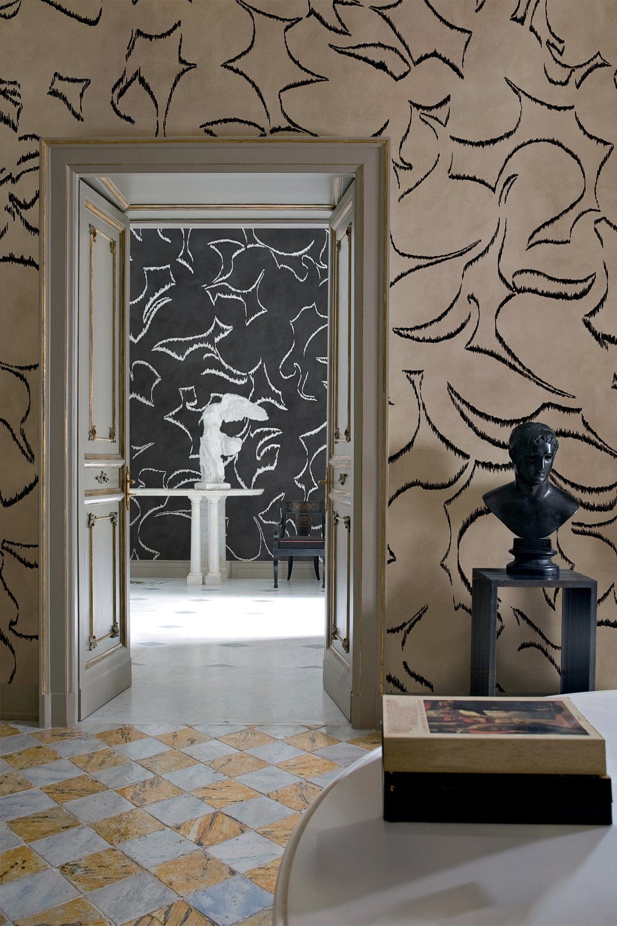 Decorative interior with a beige and black floral patterned wallpaper, a door, and a bust.