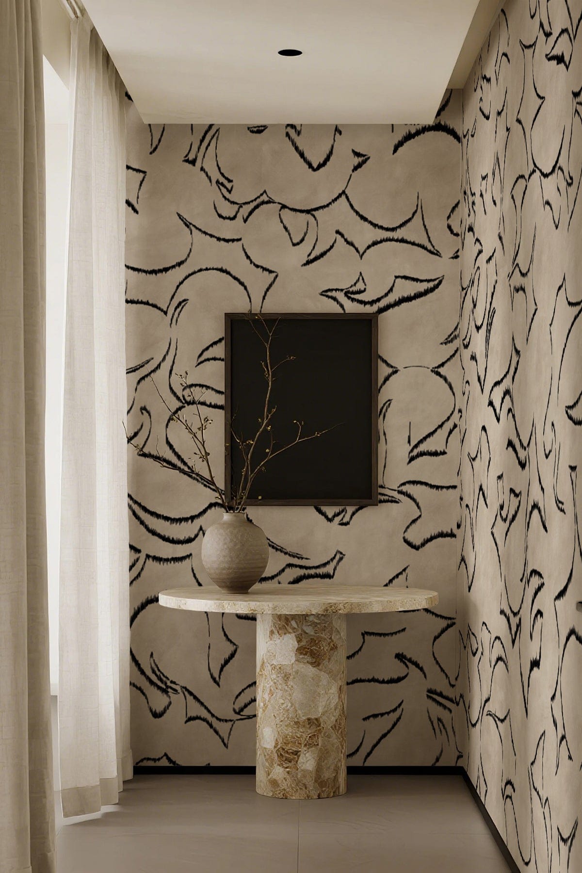 This wall mural is built from hand-sketched lines, where abstract floral forms emerge through fluid, confident contours. Drawn by hand, the shapes carry a raw elegance, imperfect in the most intentional way. Against a soft sand-toned background, the black lines appear to float freely, creating movement and visual rhythm. The expression is artistic and modern, with a subtle edge that elevates the space. It’s an interpretation of flowers rather than a depiction. Designed for interiors that value creativity, individuality and a curated aesthetic