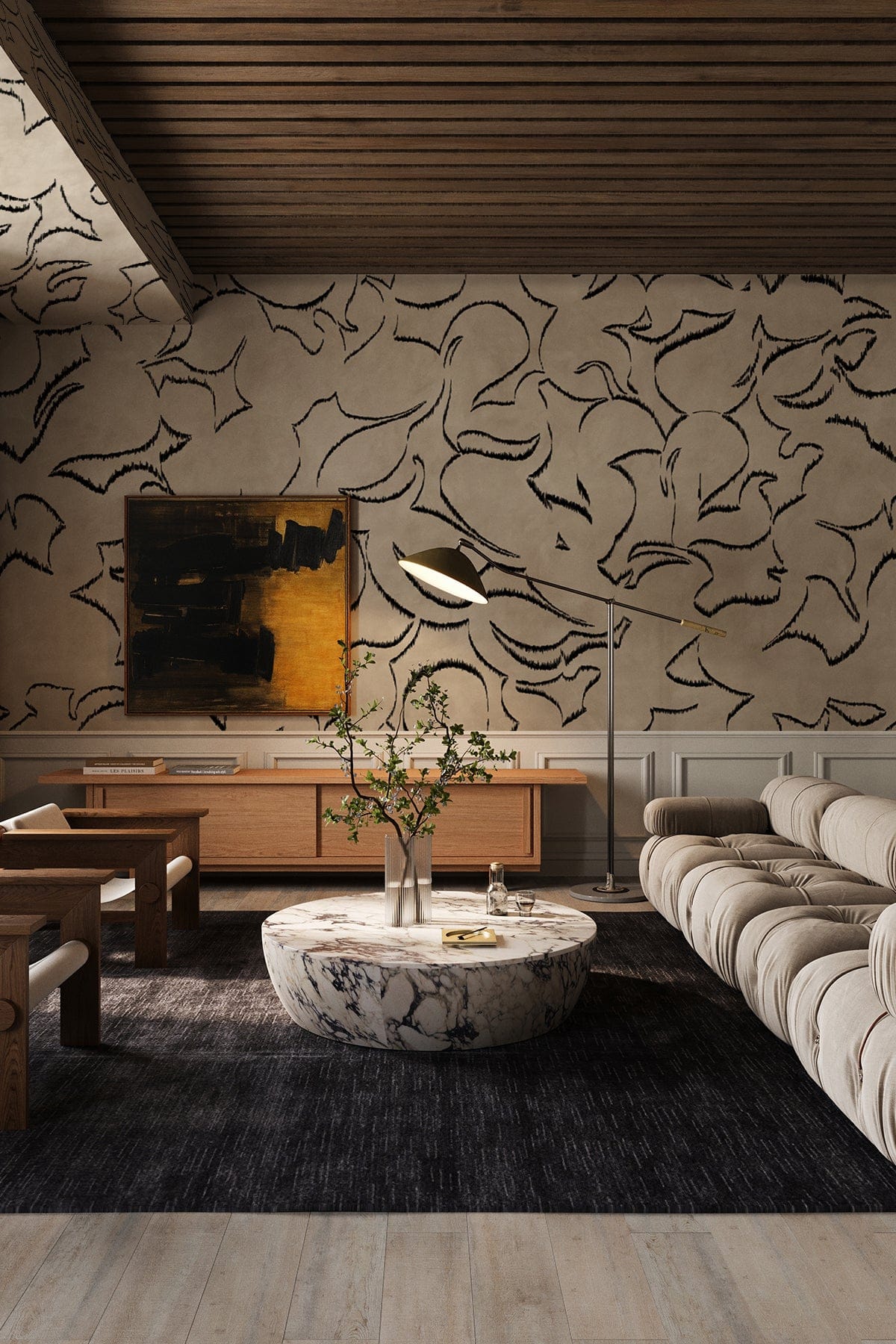 Modern living room with black and sand floral patterned wallpaper, wooden furniture, and a sofa.